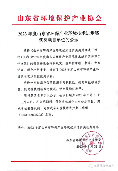 | 山東省環(huán)保產(chǎn)業(yè)環(huán)境技術(shù)進(jìn)步獎(jiǎng) | 省級(jí) | 山東省環(huán)境保護(hù)產(chǎn)業(yè)協(xié)會(huì) |