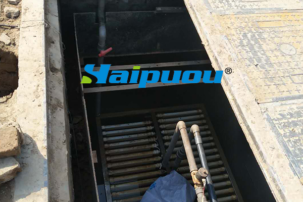 1、曝氣裝置可以固定在池底(需要做膜組件承托架和膜組件滑入導(dǎo)軌),也可以跟膜組件做在一起,各有優(yōu)劣,曝氣管的位置要做精心考慮,采用DN20穿孔管,每個膜片間隙對應(yīng)一路穿孔管,穿孔大小Φ2.0mm,穿孔間距100mm,相鄰兩路管穿孔位置交錯穿插,孔口做單排垂直向上。
