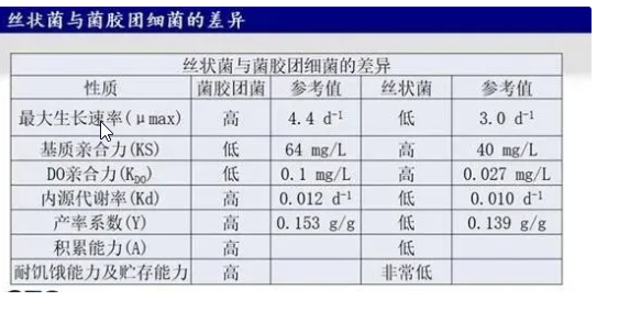 活性污泥是一種混合培養系統,其中至少有30種絲狀菌可能導致污泥膨脹。絲狀菌和膠束菌平衡生長不會出現污泥膨脹的問題,只有絲狀菌比膠束菌生長多才會出現污泥膨脹。絲狀菌和膠束菌的生理生化特性差異如下表所示。