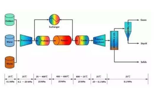 SCWO以超臨界水為介質,均相氧化分解有機物。有機污染物可在短時間內分解成無機小分子,如CO2、H2O,硫、磷和氮分別轉化為硫酸鹽、磷酸鹽、硝酸根和亞硝酸根離子或氮。美國將SCWO法列為能源和環境領域最有前途的廢物處理技術。