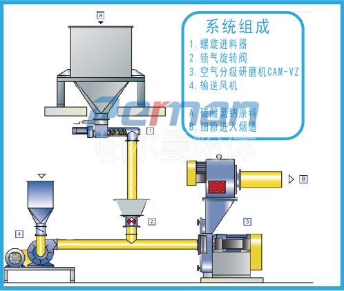 此流程中碳酸氫鈉從原料倉通過變頻螺旋輸送機定量的供給下游的CAM-H系列空氣研磨機。所需的吸附劑的量可由脫硫前后的污染物濃度趨勢曲線計算。在螺旋輸送機和研磨機之間安裝旋轉閥,用于隔離氣流,以免氣流影響螺旋輸送機的定量進料。碳酸氫鈉在分級磨中進行研磨后,細粉由一臺物料輸送風機輸送至煙氣管道。