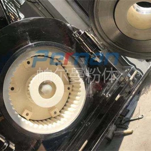 CAM-S雙軸陶瓷粉碎機工作運轉中物料由加料系統均勻的送入粉碎室受到高速旋轉的粉碎盤的強烈沖擊,同時受到離心力的作用,與粉碎齒圈發生碰撞,受到剪切、摩擦、碰撞等多種綜合力的作用,使物料粉碎,被粉碎的物料隨氣流運動到分級區,通過變頻調節的分級輪,對粗細物料進行分離,符合細度要求的產品隨氣流進入旋風收集器和除塵器收集,粗物料返回分級區二次粉碎。
