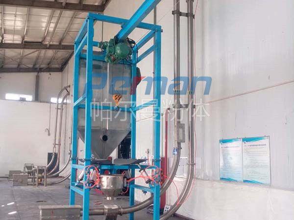 生產原材料會在皮帶輸送的作用進行進入到噸袋拆包機中進行拆包作業,分離出的散料會在出料口直接進入到管鏈輸送機設備入料口中進行傳輸作業。